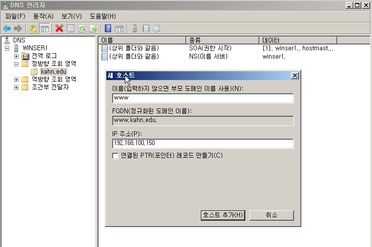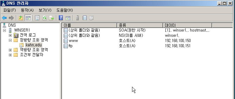 서버에서 새로운 영역을 만들고 이름을 kahn.edu로 지정,