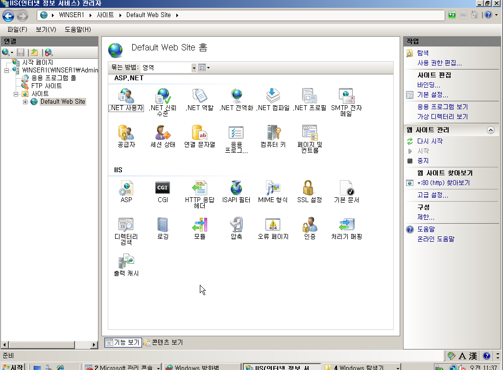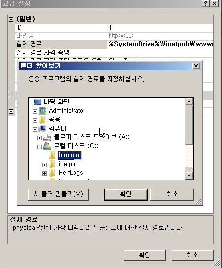 IIS 인스톨 이후 새로추가된 관리도구에서 설정을 해본다.