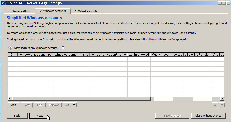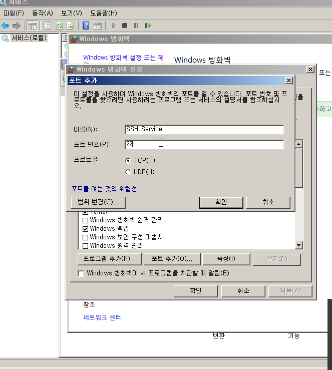 (방화벽 설정, Bitvise가 나오지 않아 커스텀으로 추가. 서비스명을 지정하고 사용하게될 포트22(SSH)를 지정후 저장한다.)