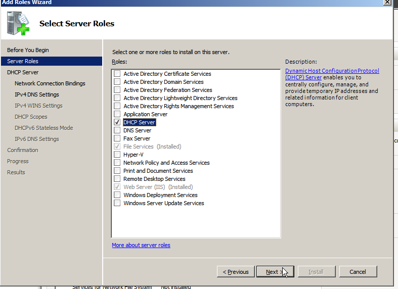 시작 IP, 종료 IP, DHCP 서버명, 서브넷, 게이트웨이 등 다양한 설정을 하고 Install을 완료한다.