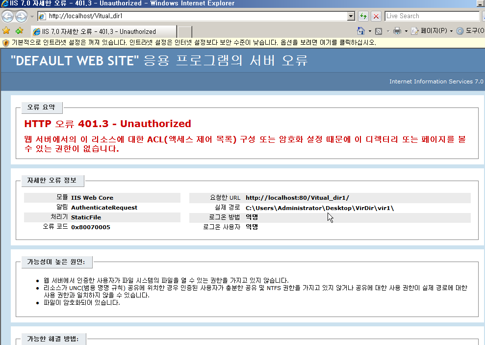 가상디렉터리 메뉴에서 위와 동일하게 설정 시, 가능하다.