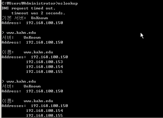 (cmd -nslookup을 통해서 확인해보면 설정해둔 다양한 ip주소가 번갈아가며 나온다.)
