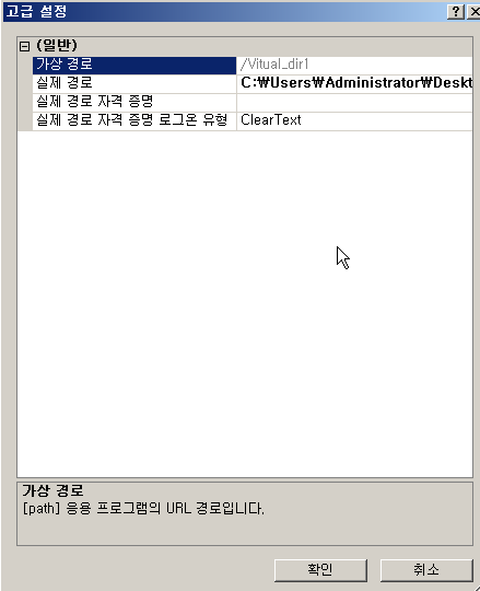 이후 가상 디렉터리 추가해준다(이때 가상 경로명을 지정해주고, 차후 이 경로명으로 접속해야한다.)