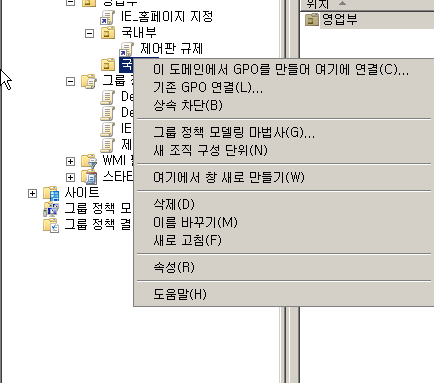 ▪ GP를 제거하려면, 시작>관리도구>그룹정책>좌측창에서 해당 OU를 선택하고>우측창에서 해당 정책을 우클릭한 뒤>삭제를 클릭하면 삭제된다. 메시지 창에서 확인을 클릭한다.