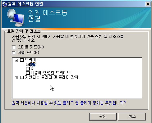 원격 접속> 옵션 > 로컬 리소스 > 자세히 에서 필요한 리소스를 선택 후 연결