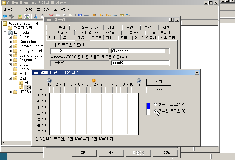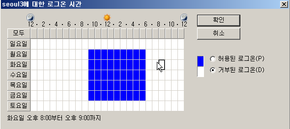 가입된 user 우클릭 속성 > 계정> 로그온 시간에서 변경 가능
