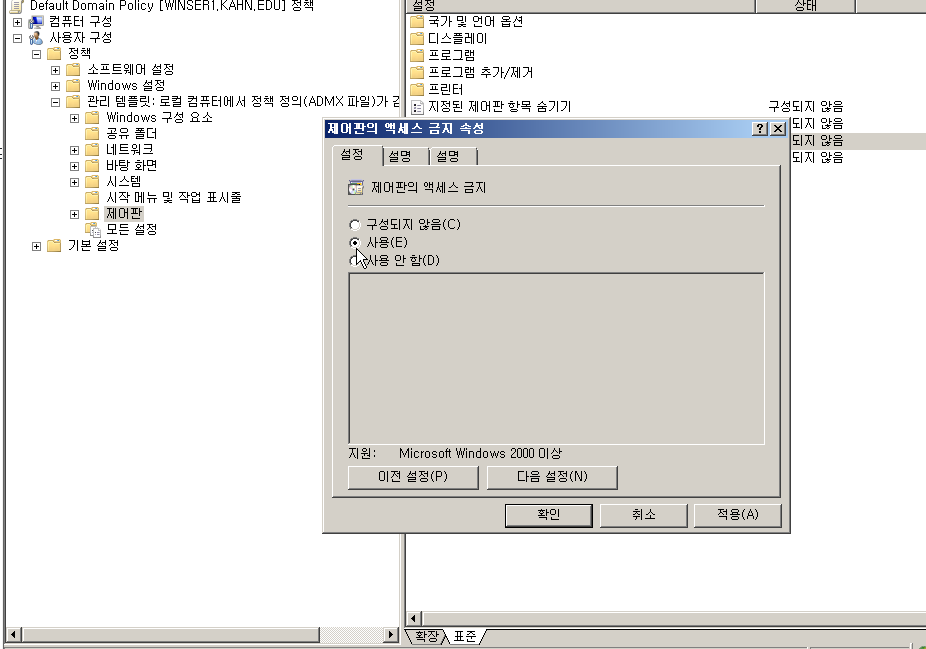 (그룹 정책관리 편집기에서 사용자 구성에서 제어판 액서스 금지 사용으로 전환)