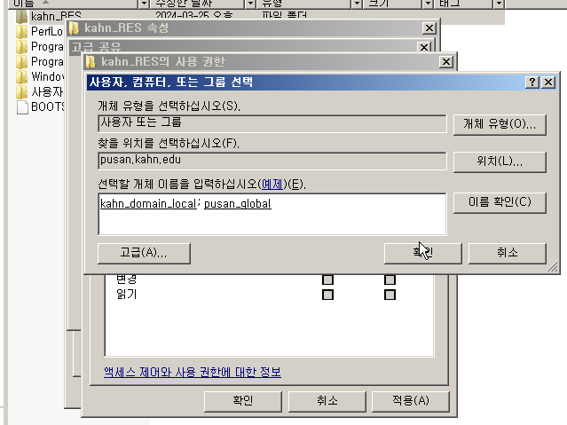 =>서울의 KAHN.EDU에 C:\kahn_RES 리소스를 서울의 seoul2, 부산의 pusan2 사용자가 이용하게 한다면