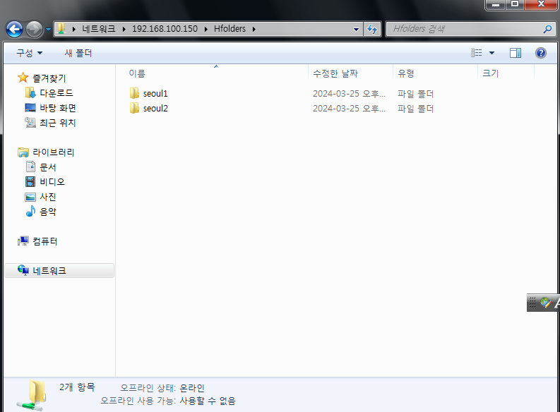 이후, Win7(서울 도메인에 속한 워크스테이션)에서 부산 도메인으로 들어간 후, pusan2로 로그인 후 확인해보면, 정상적으로 리소스 폴더를 확인 할 수 있다.
