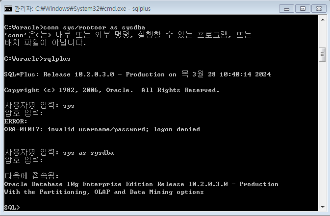 conn sysdba as sysdba 해주고 rootoor 패스워드를 줘서 로그온하고