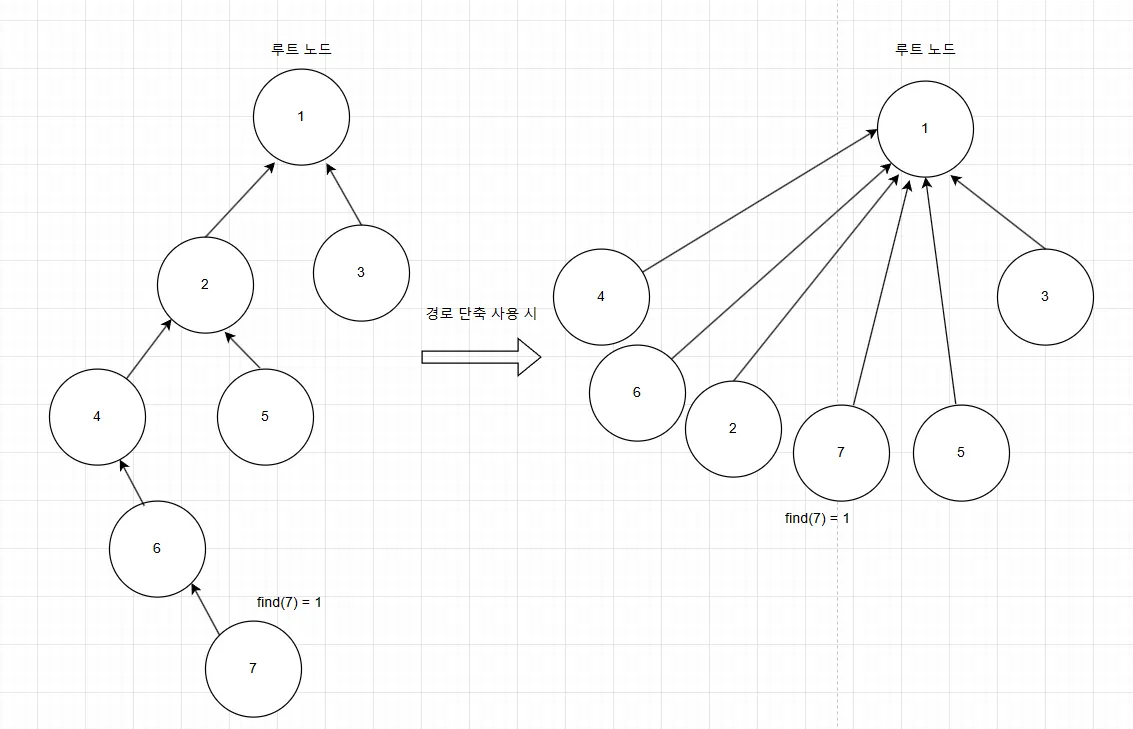 이는 추후에 7의 직계 조상 (부모, 부모의 부모, …) 노드들에 find 연산을 했을 때 O(1)의 시간 복잡도를 갖게 해준다.