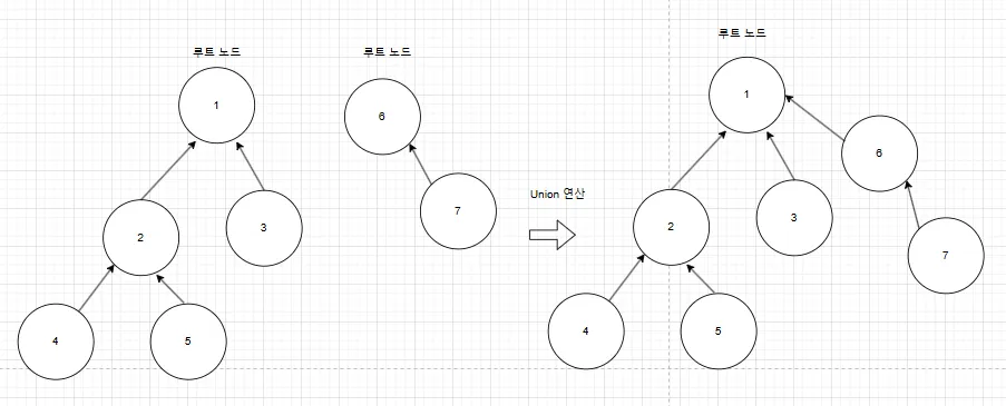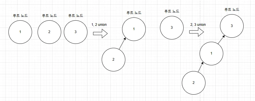 // x, y 두 요소의 루트 노드를 찾은 뒤, y의 루트 노드를 x의 루트 노드 아래로 연결시킨다.