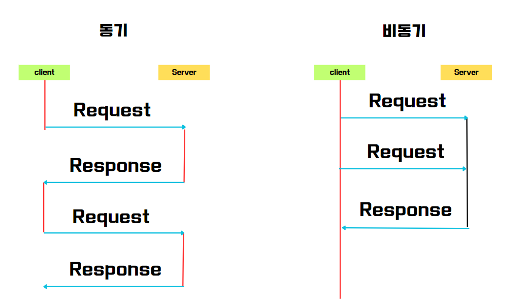 동기는 작업을 순차적으로 처리하고 기다리는 반면, 비동기는 병렬적으로 처리하고 중간에 다른 작업을 실행한다.