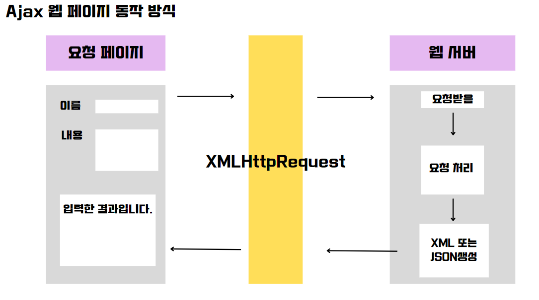 위 그림에서 XMLHttpRequest는 JavaScript에서 제공되는 객체로 코드에 드러나진 않지만 자동으로 브라우저와 서버간의 통신을 할 수 있게 API를 제공한다. 이 XMLHttpRequest 객체를 사용하여 서버로 데이터를 요청하고 응답을 받아 올 수 있다.