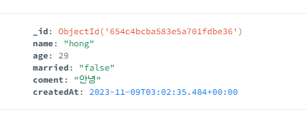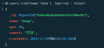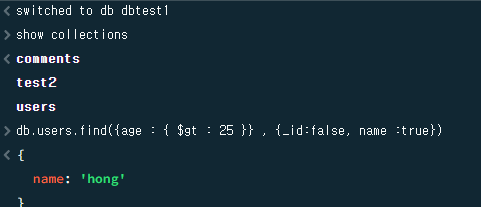 현재 db의 users컬렉션에 접근해서 name:hong인 컬렉션을 찾는다는 명령어이다.
