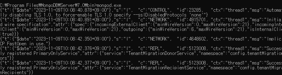 C:\Program Files\MongoDB\Server\7.0\bin 이렇게 빈가지 들어가서 해줘야한다.