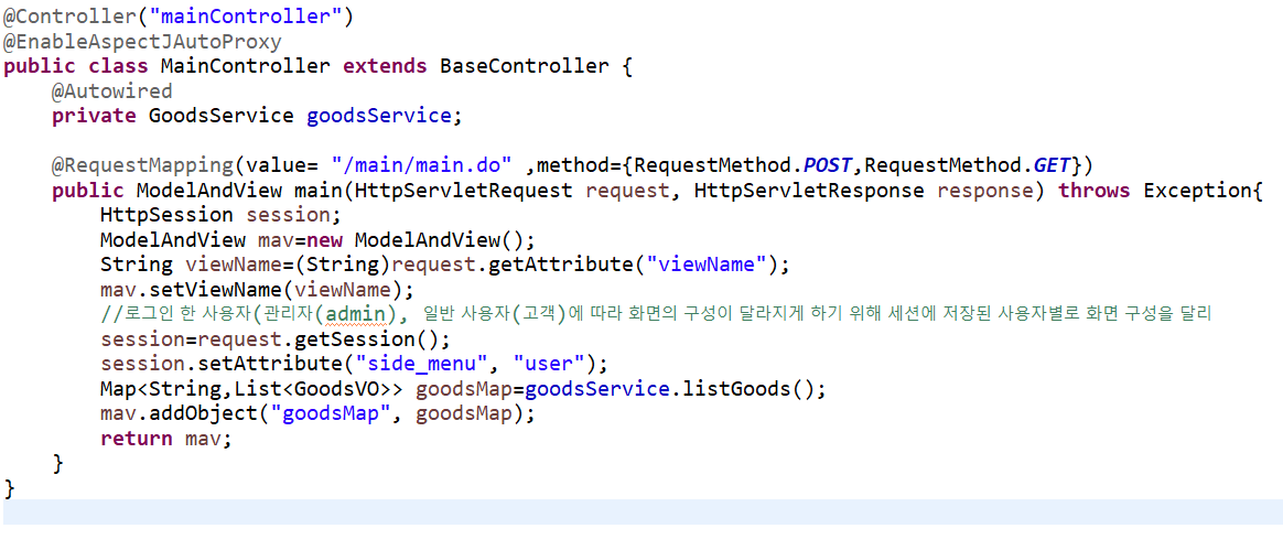 위는 maincontroller인데 코드를 보면 ModelAndView객체에 viewName과 데이터를 담아서