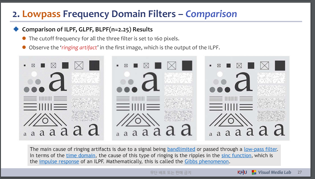 ⚫ 첫 번째 이미지에서 ILPF의 출력인 '울리는 아티팩트'를 관찰하세요.