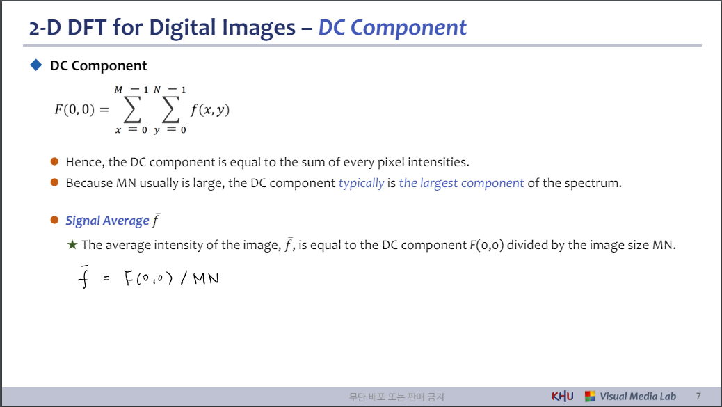 ★ 이미지의 평균 강도 𝑓ҧ는 DC 구성 요소 F(0,0)를 이미지 크기 MN으로 나눈 값과 같습니다.