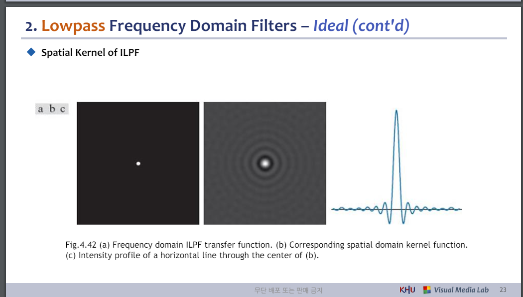그림 4.42 (a) 주파수 영역 ILPF 전달 함수. (b) 해당 공간 도메인 커널 기능.