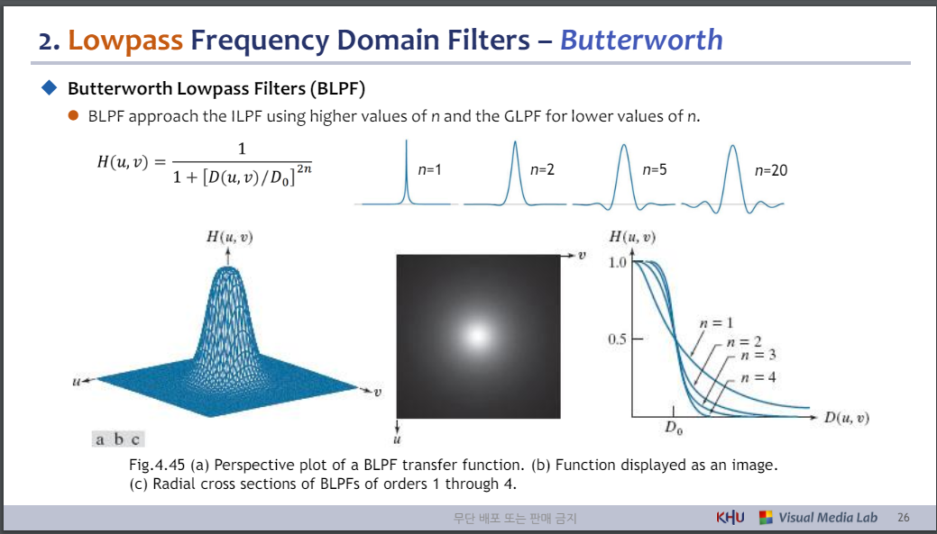 ⚫ BLPF는 더 높은 n 값을 사용하고 GLPF를 더 낮은 n 값에 사용하여 ILPF에 접근합니다.