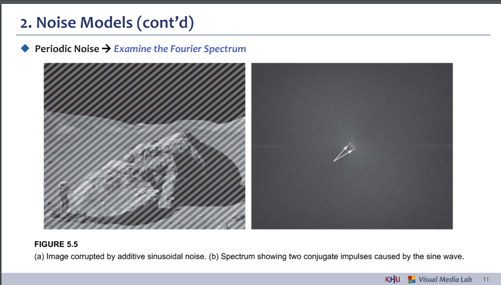 ⚫ 주기적인 노이즈의 매개변수는 일반적으로 푸리에 스펙트럼을 검사하여 추정됩니다.