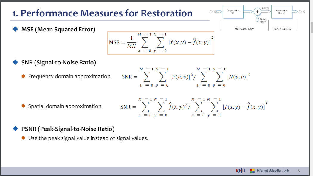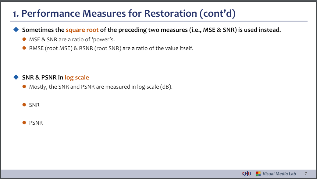◆ 때로는 앞의 두 측정값(예: MSE 및 SNR)의 제곱근이 대신 사용됩니다.