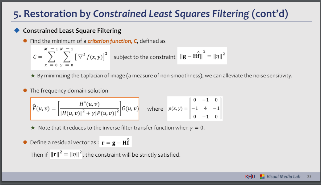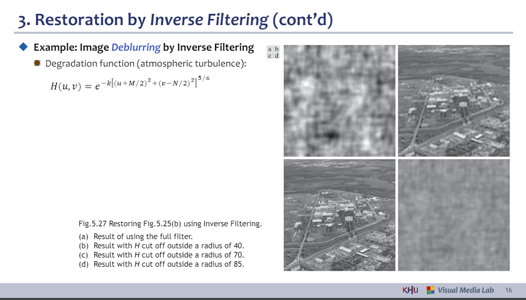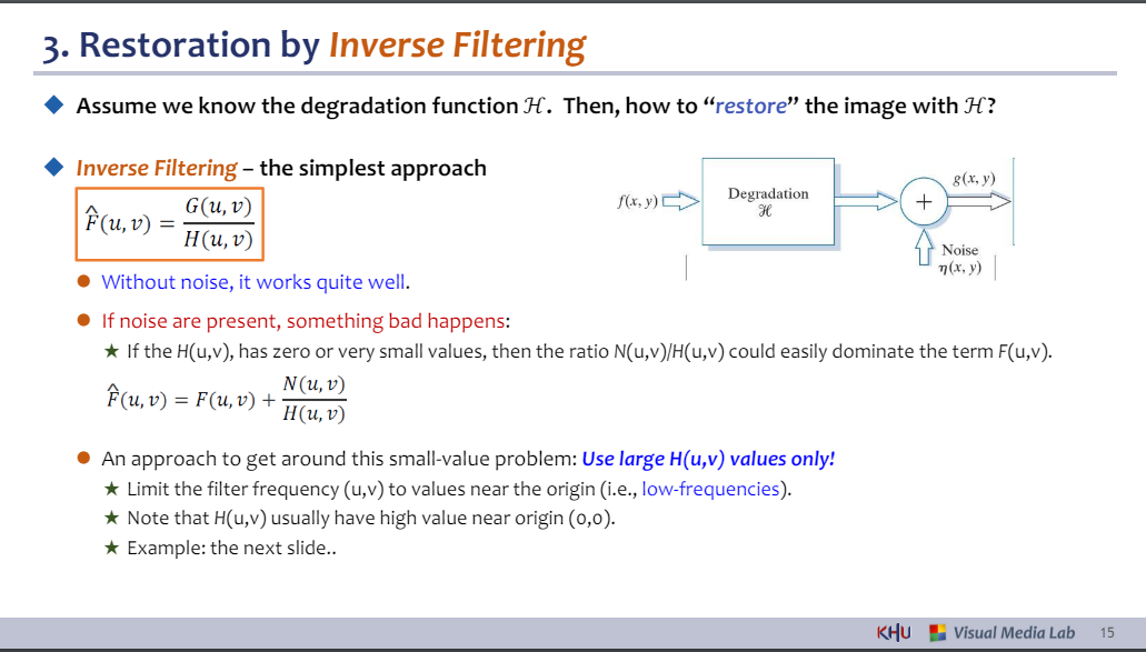 ★ H(u,v)의 값이 0이거나 매우 작은 경우 N(u,v)/H(u,v) 비율이 F(u,v) 항을 쉽게 지배할 수 있습니다.