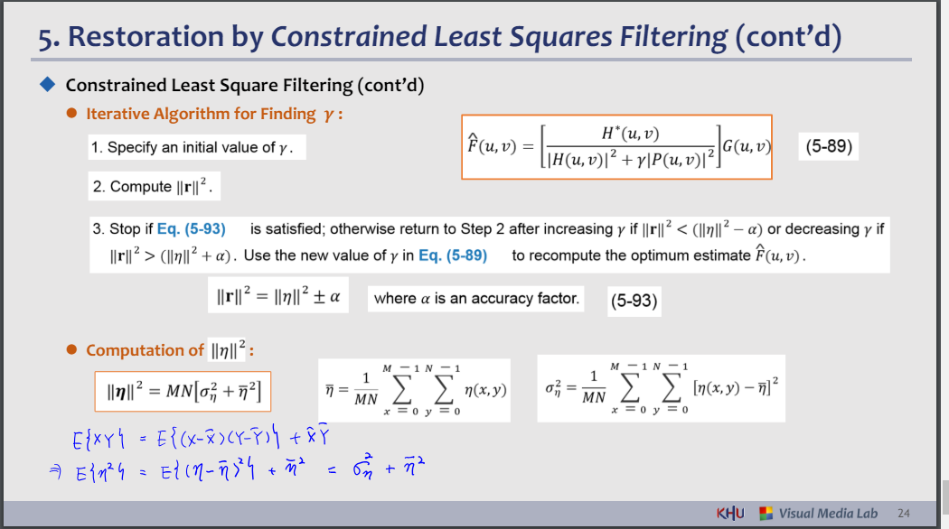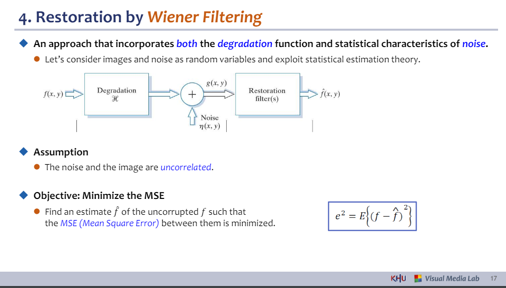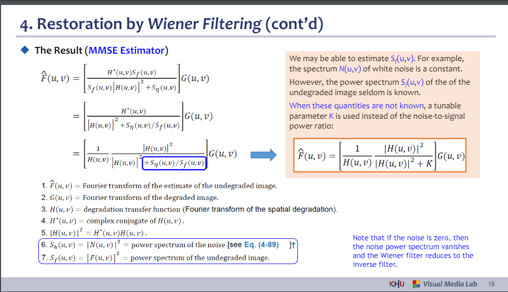 우리는 Sf(u,v)를 추정할 수 있습니다. 예를 들어, 백색 잡음의 스펙트럼 N(u,v)는 상수입니다.