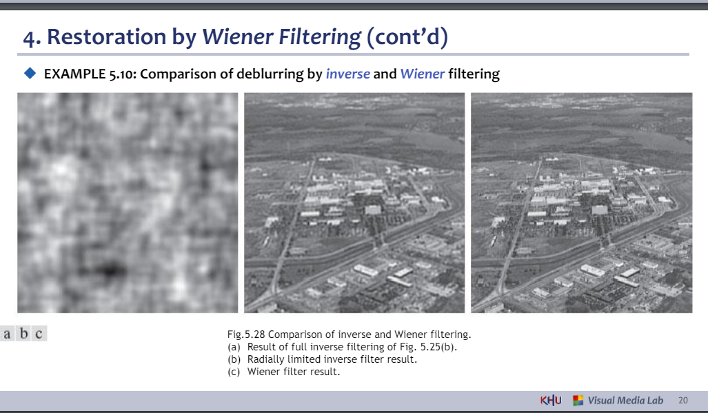 ◆ 예 5.10: 역필터링과 Wiener 필터링에 의한 디블러링 비교