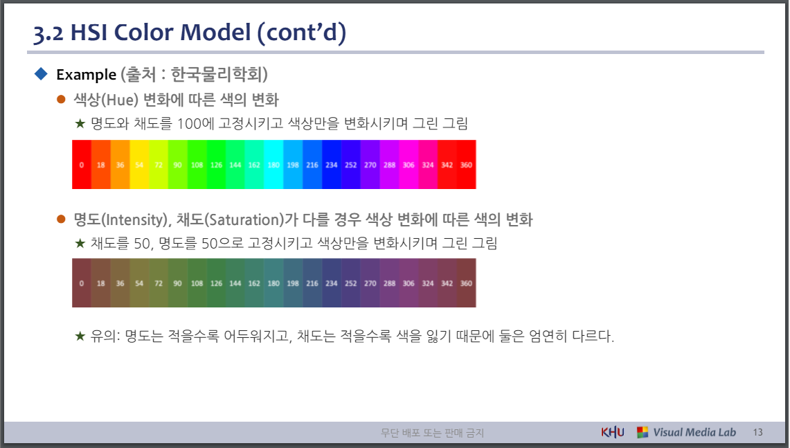 ⚫ (-) 불행하게도 RGB, CMY 및 기타 유사한 색상 모델은 인간의 해석에 실용적인 용어로 색상을 설명하는 데 적합하지 않습니다.