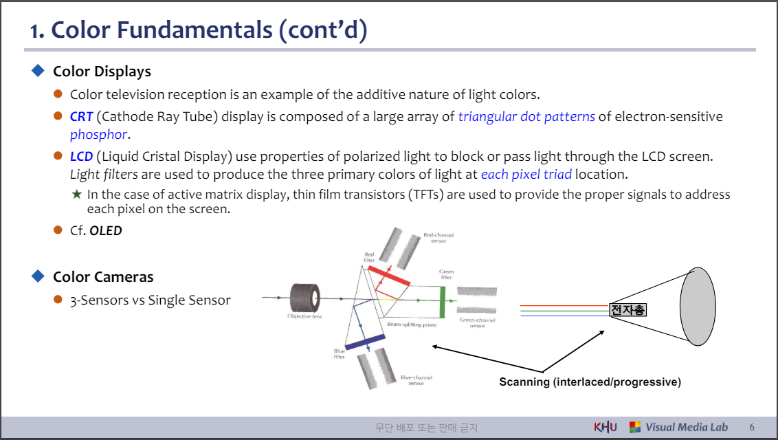 광 필터는 각 픽셀 트라이어드 위치에서 빛의 세 가지 기본 색상을 생성하는 데 사용됩니다.