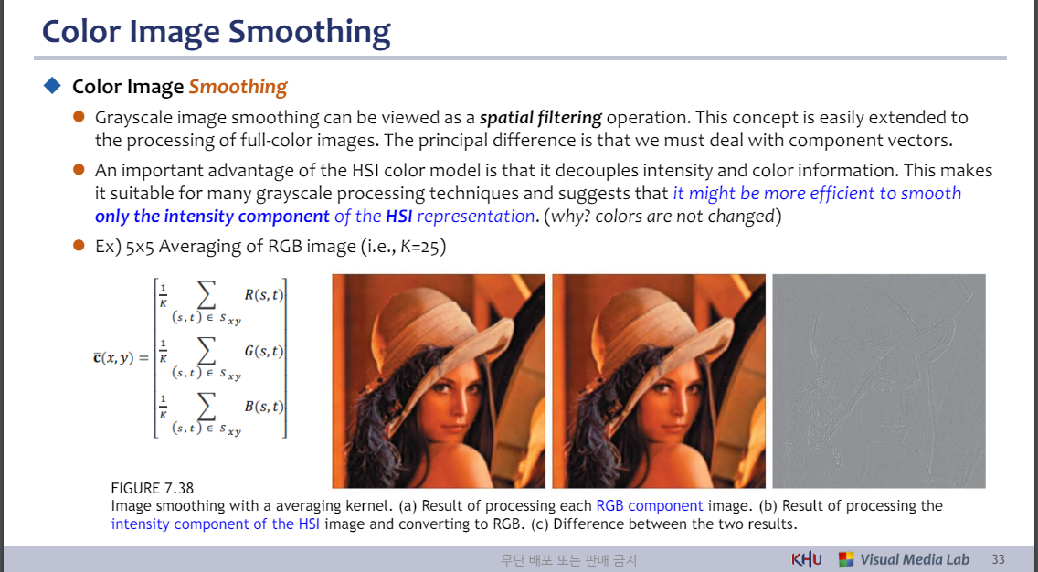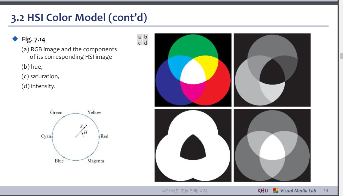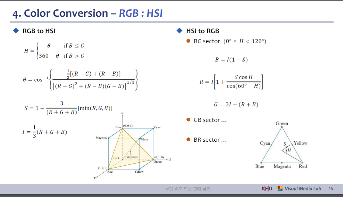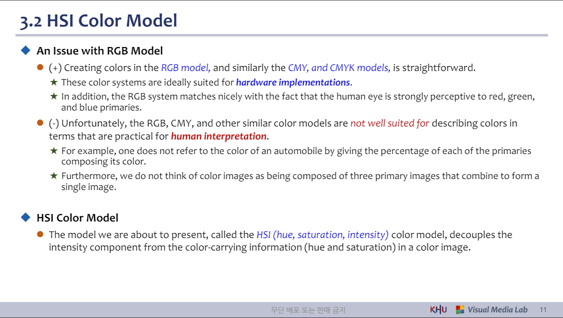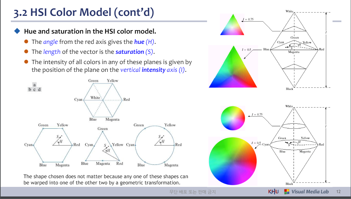 ⚫ 우리가 제시할 모델은 HSI(색조, 채도, 강도) 색상 모델로, 컬러 이미지의 색상 전달 정보(색상 및 채도)에서 강도 구성 요소를 분리합니다.
