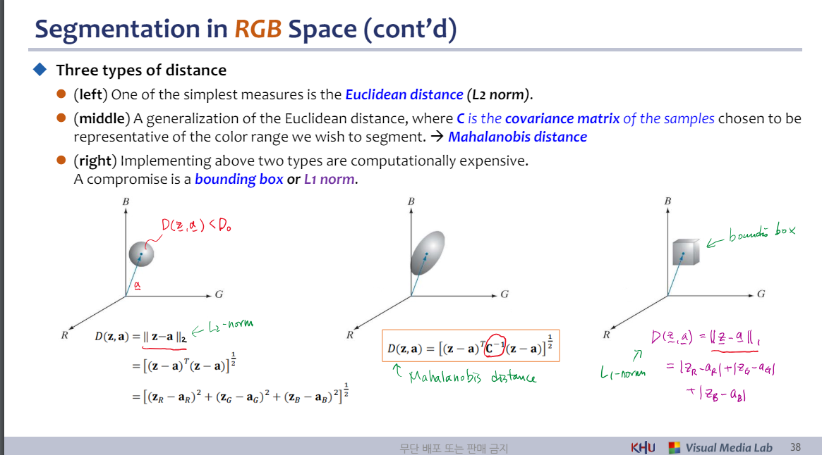 ⚫ (중간) 유클리드 거리의 일반화. 여기서 C는 분할하려는 색상 범위를 나타내기 위해 선택한 샘플의 공분산 행렬입니다. → 마할라노비스 거리