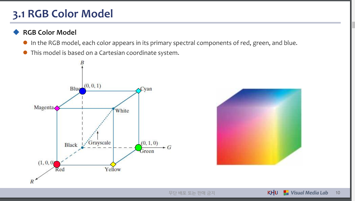 ⚫ RGB 모델에서 각 색상은 빨간색, 녹색, 파란색의 기본 스펙트럼 구성 요소로 나타납니다.