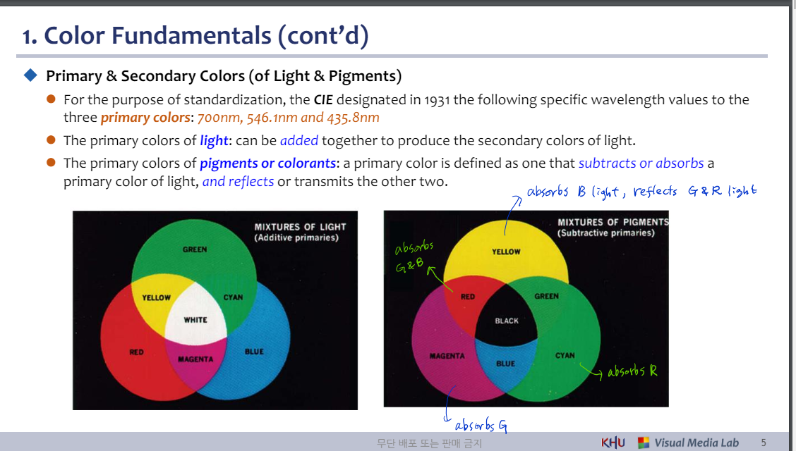 ⚫ 안료나 착색제의 기본색 : 빛의 기본색 중 하나를 빼거나 흡수하고, 나머지 두 가지 색상은 반사하거나 투과시키는 색상을 원색이라고 정의합니다.