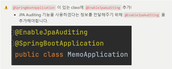 - Spring Data JPA에서는 시간에 대해서 자동으로 값을 넣어주는 기능인 JPA Auditing을 제공하고 있다.
