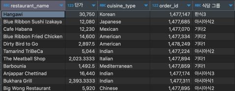when (price/quantity <5000) and cuisine_type in ('Japanese', 'Chinese', 'Thai', 'Vietnamese', 'Indian') then '아시아식1'