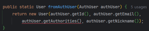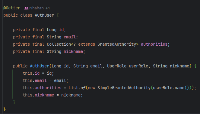 User 클래스의 생성자가 AuthUser의 authorities 필드 타입과 일치하지 않기 때문이다. 아래 사진과 같이 authUser.getAuthorities()는 Collection<? extends GrantedAuthority> 타입을 반환하지만, User 클래스의 생성자가 이 타입을 수용할 수 있도록 정의되지 않은 경우 오류가 발생할 수 있다.