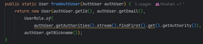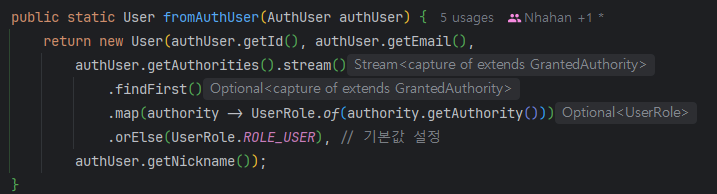 사용자의 권한 목록에서 첫 번째 권한을 Optional로 가져온 후, Optional 값이 존재할 때, UserRole.of()를 사용해 GrantedAuthority를 UserRole로 변환한다. Optional 값이 비어 있을 경우, 기본값으로 UserRole.ROLE_USER를 사용한다.