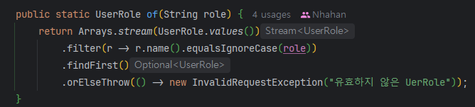 UserRole.of 메서드는 문자열을 받아서 해당하는 UserRole 열거형을 찾고, 찾지 못하면 예외를 발생시키는 역할을 한다.이렇게 하면 권한이 없거나 설정되지 않은 경우에도 안전하게 기본 역할을 지정할 수 있다!!