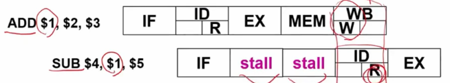 아래의 그림을 살펴보면, EX MEM가 이루어질 때 stall로 지연시킨 후 WB에 도달했을 때 비로소 ID를 실행시키어 data를 저장함과 동시에 읽는 작업이 일어나게 된다.