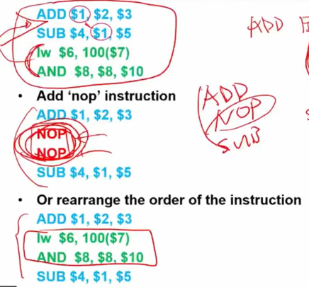 예를 들어 뒤에 data dependency가 일어날 경우 NOP를 삽입하거나, 재배열을 통해 이를 막게 된다.