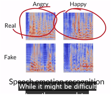 음성의 경우도 주로 spectrogram을 사용하는데, 이 spectrogram을 generate함으로 angry happy 등 감정의 음성들을 생성해 낼 수 있습니다.