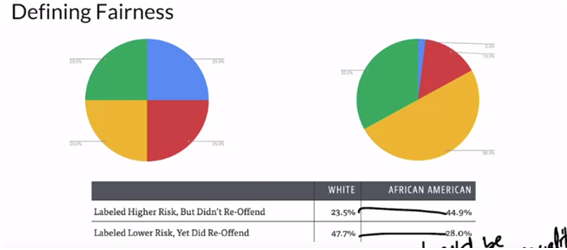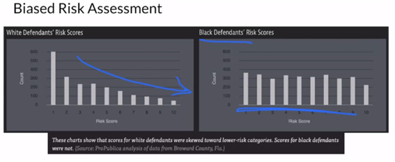 범죄 추정과 관련하여 기계가 추정했을 때, 이와 같이 흑인들의 risk score값이 훨씬 높다는 것을 확인할 수 있다. 이러한 부정확한 bias가 첨가되어 있는 판단들은 이로 인한 피해가 막연하기에 절대적으로 공정하다고 할 수 없다. 그렇기에 단순히 모델의 성능 뿐 아니라 Machine bias와 같이 실질적으로 누구에게 도움이 되며, 피해를 받게 되는 경우는 어떤 것 들이 있는 지 잘 확인해 보아야 한다.