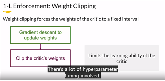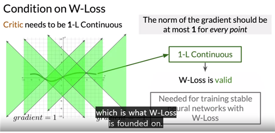 Wasserstein Loss를 사용하기 위해서는 critic에 대한이 조건이 필요하다. 1-L Continuous를 만족해야 하는데, 이것은 W-손실 기능이 지속적이고 차별화 될뿐만 아니라 너무 많이 성장하지 않고 훈련 중에 안정성을 유지하게 해준다. 이것은 critic 및 generator 신경망을 훈련하는 데 필요하며 GAN의 학습 중 안정성을 증가시켜준다.