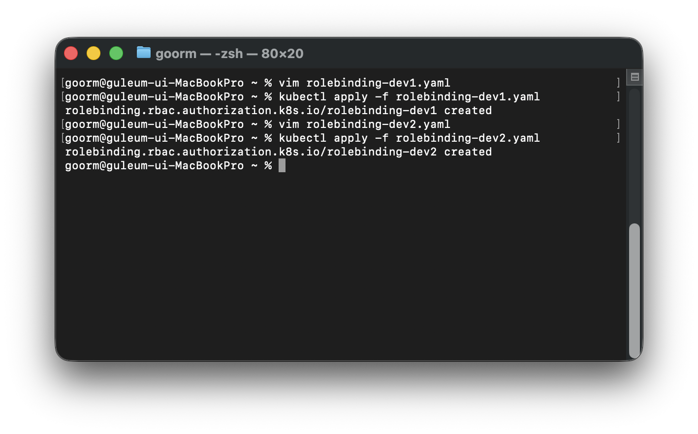 이렇게 yaml파일 생성 및 적용하여 각 dev1, dev2에 권한을 정의하였다.