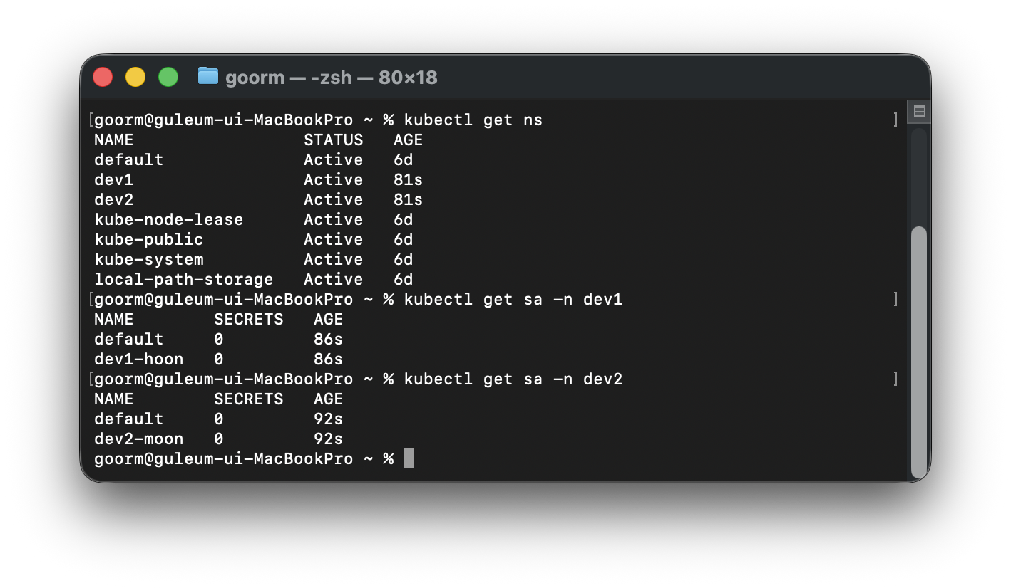 이렇게 명령어를 통해 get 해보면 dev1, dev2 각각에 전용 ServiceAccount가 준비된 상태가 된 것을 확인할 수 있다.