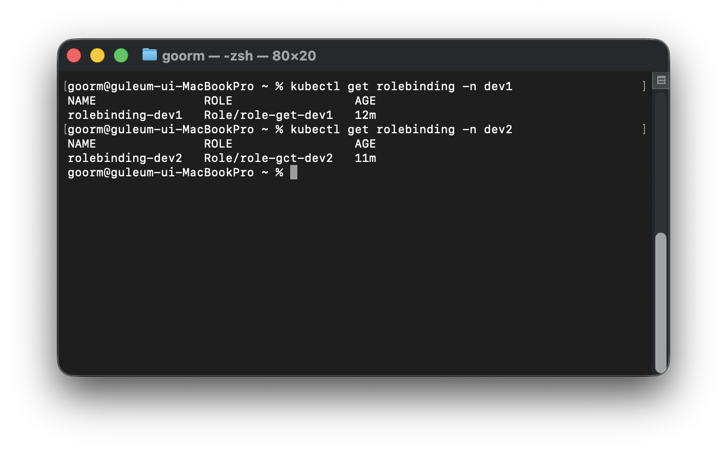 이렇게 나오면 각 네임스페이스의 서비스계정(dev1-hoon, dev2-moon)에 Role이 정상적으로 연결된 것이다.