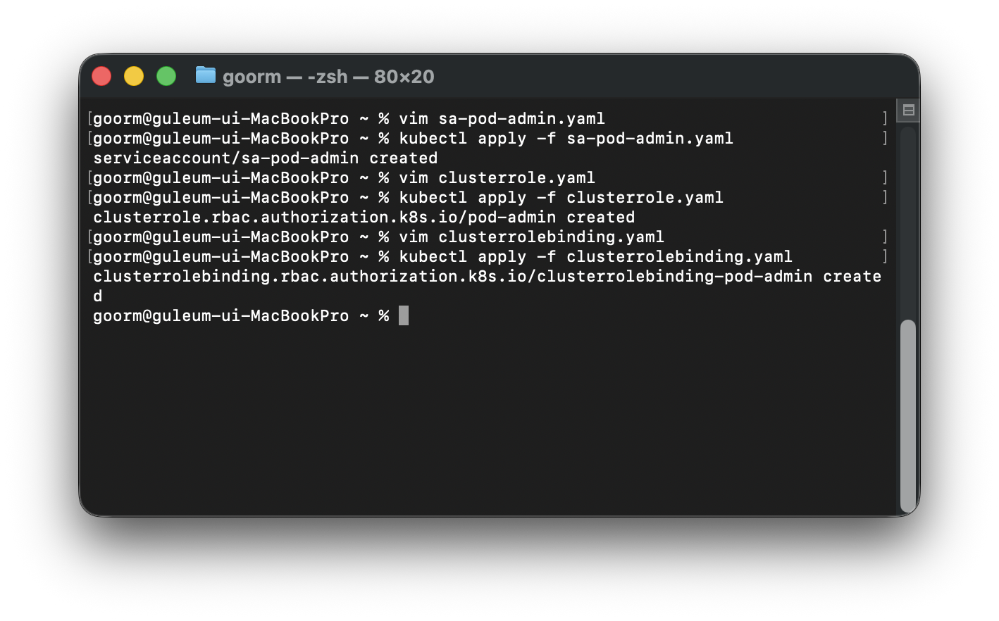 | 4 | 클러스터 전체에 적용되는 ClusterRole 생성 및 바인딩 | sa-pod-admin.yaml / clusterrole.yaml / clusterrolebinding.yaml |